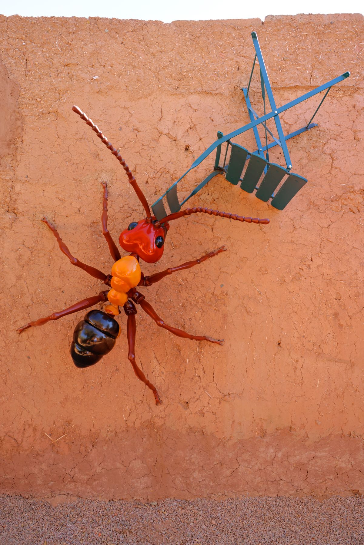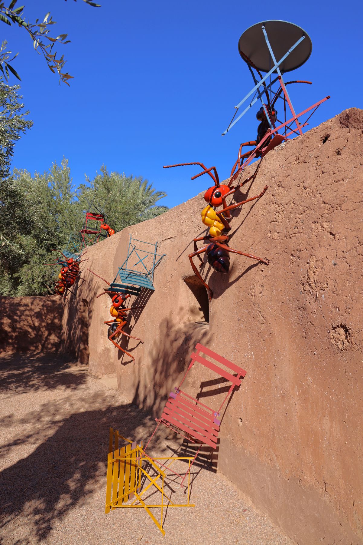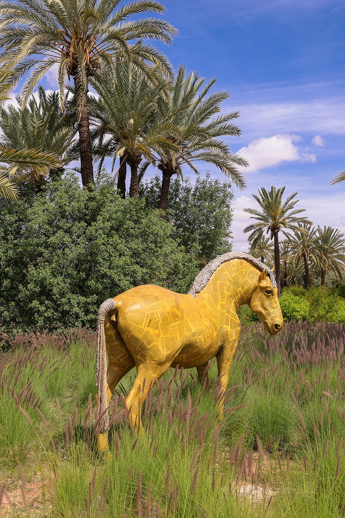 À Ramakech, il est courant de croiser quelques figures animalières ponctuant le parcours. Certains spécimens y sont nés, d’autres y ont migré. Leur taille est XXL, ils sont seuls ou en groupe et cohabitent dans un parasitage incongru et amusant des espaces.