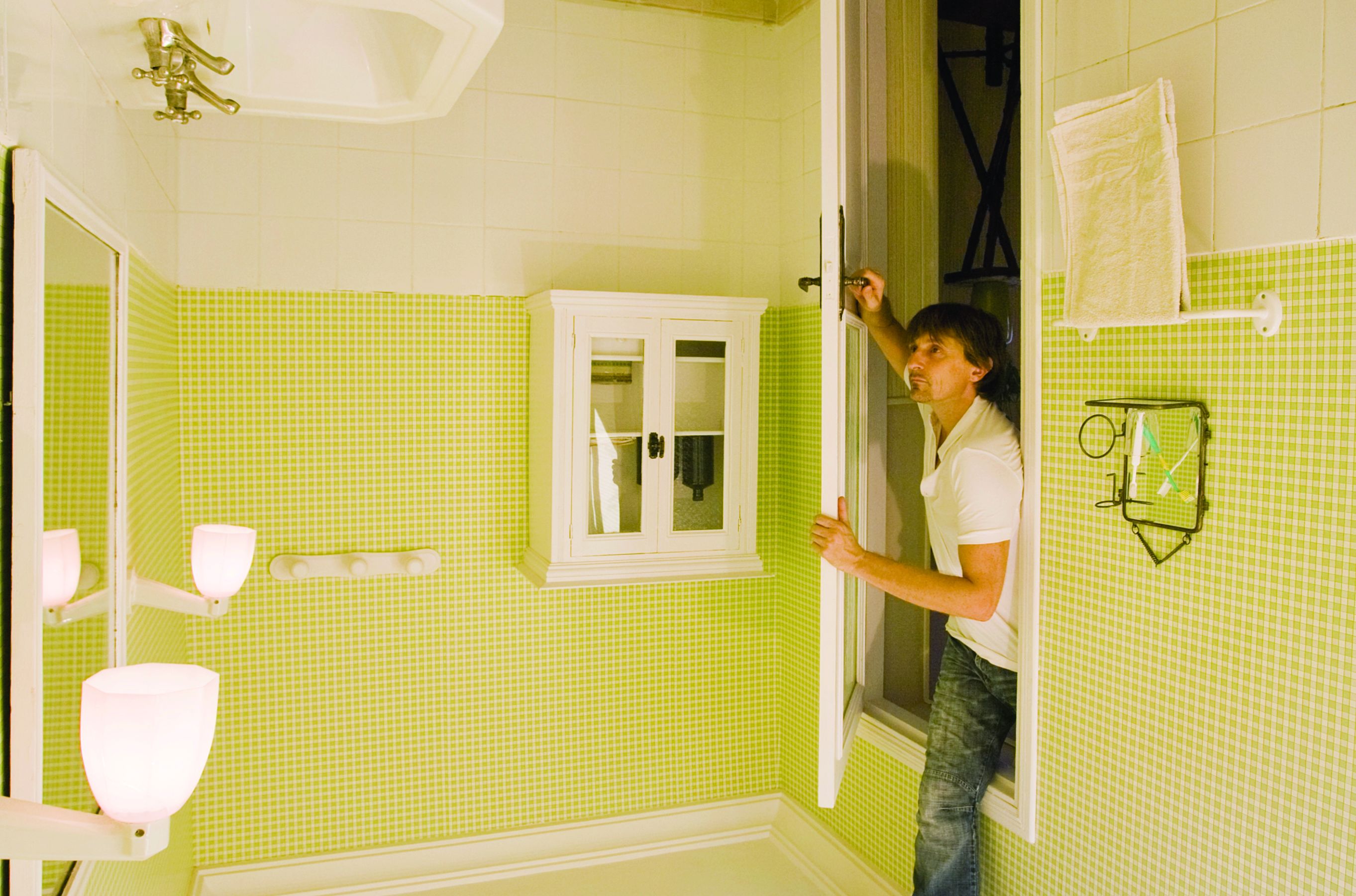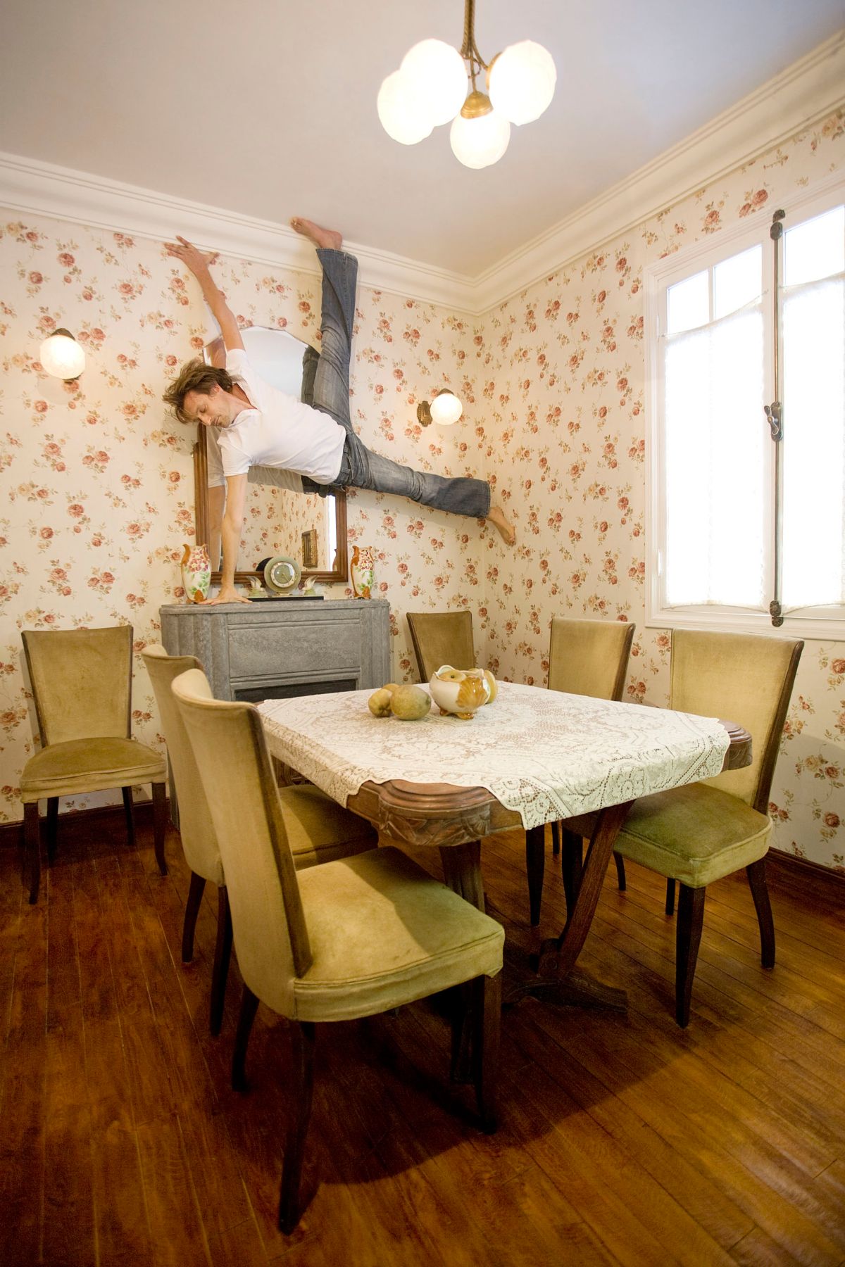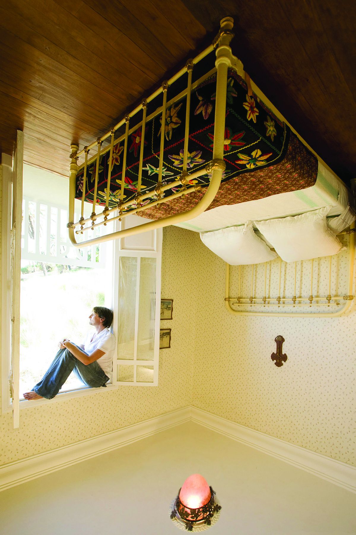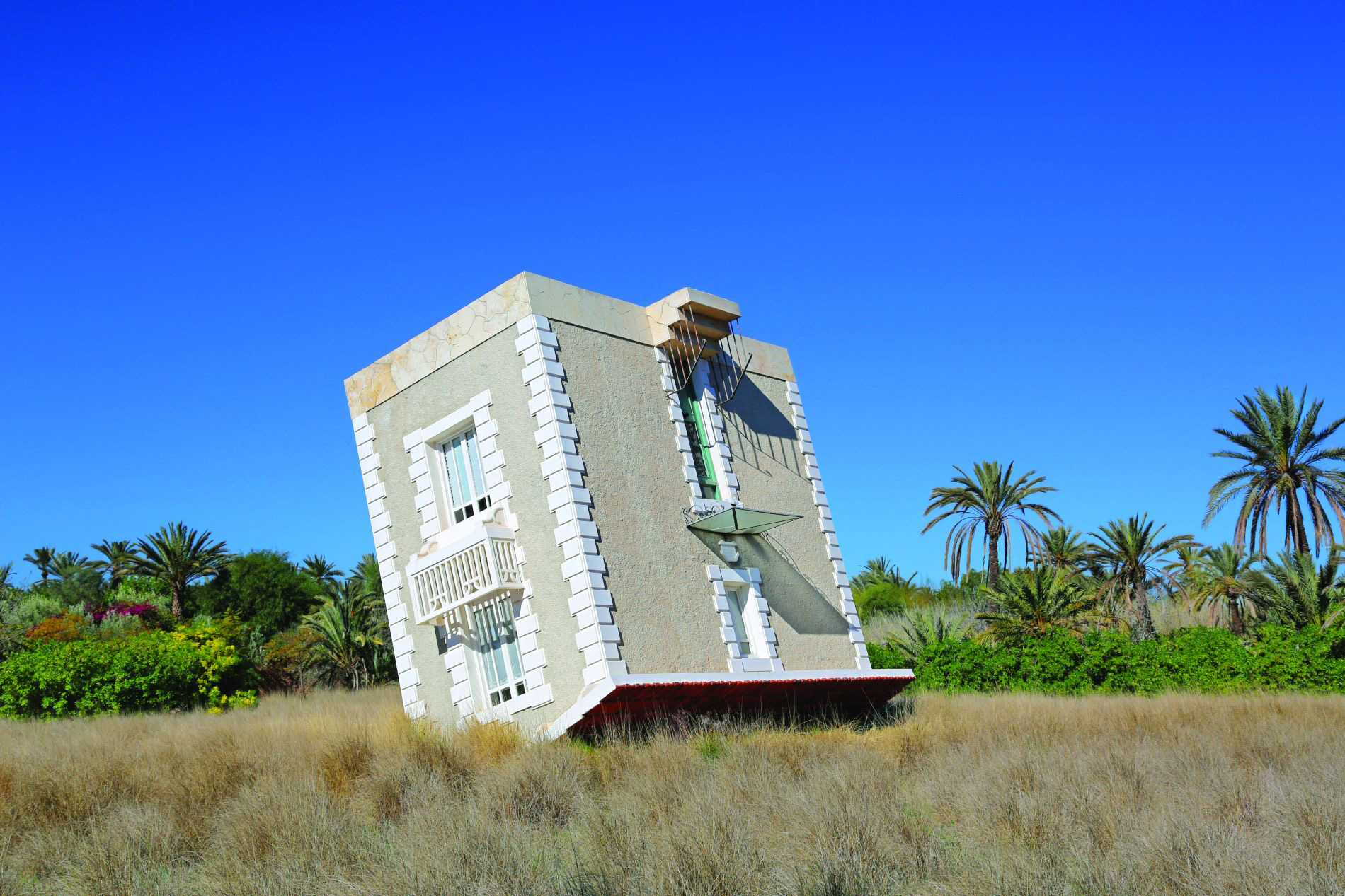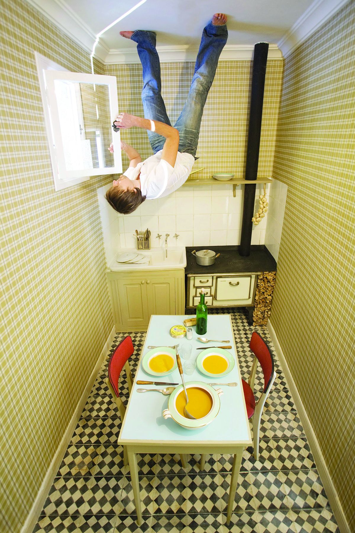 La Maison tombée du ciel s’est figée dans les herbes, renversée et flanquée sur un pan de la toiture. Architecture, meubles et objets, tout est à l’envers, penché, déstabilisant. On y marche au plafond et on y grimpe pour descendre.
